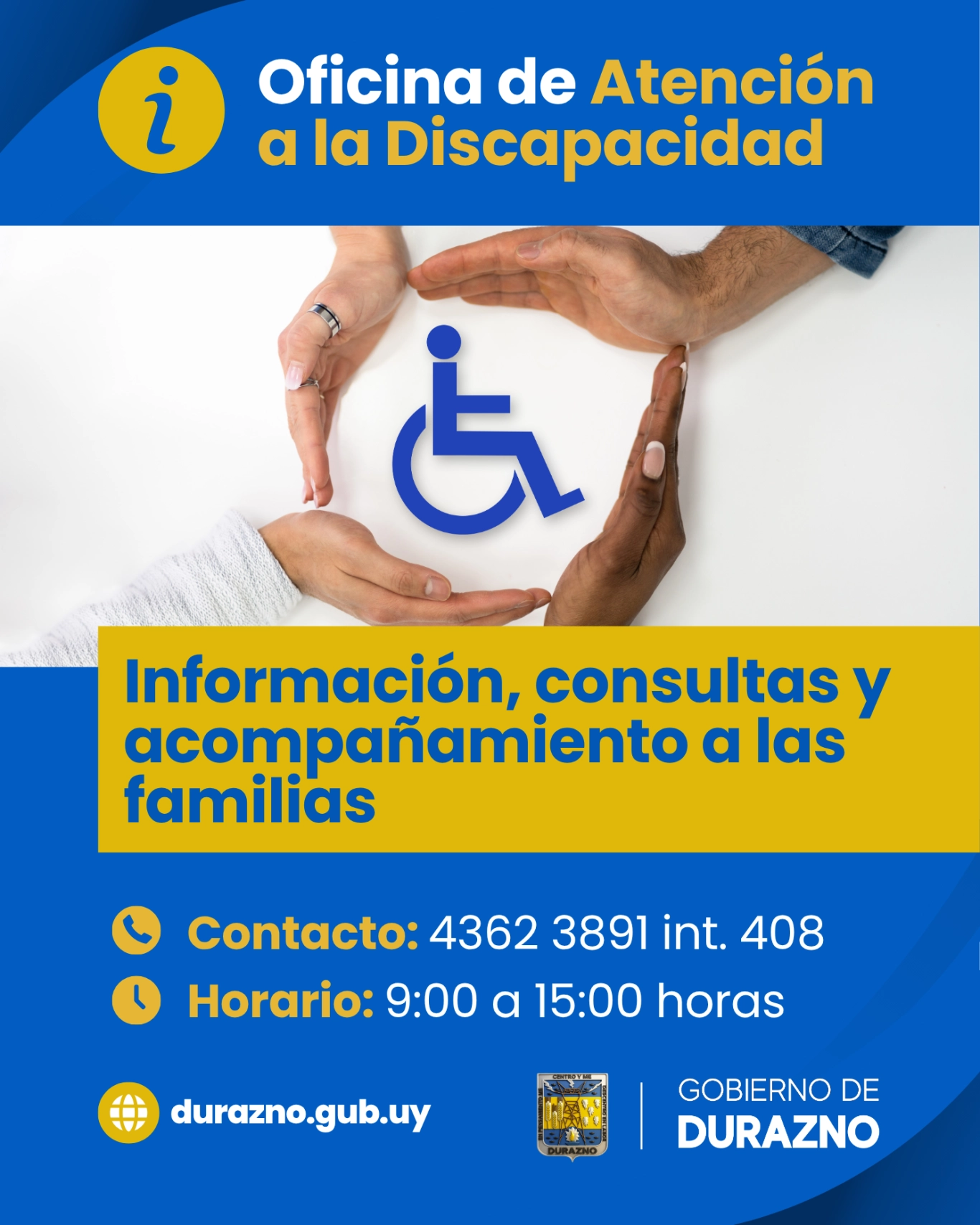 El Gobierno de Durazno, a través de la Oficina de Atención a la Discapacidad, recuerda a la población que se encuentra disponible una línea telefónica destinada a brindar información, orientación y acompañamiento a las familias en temas vinculados a la discapacidad. Leer más